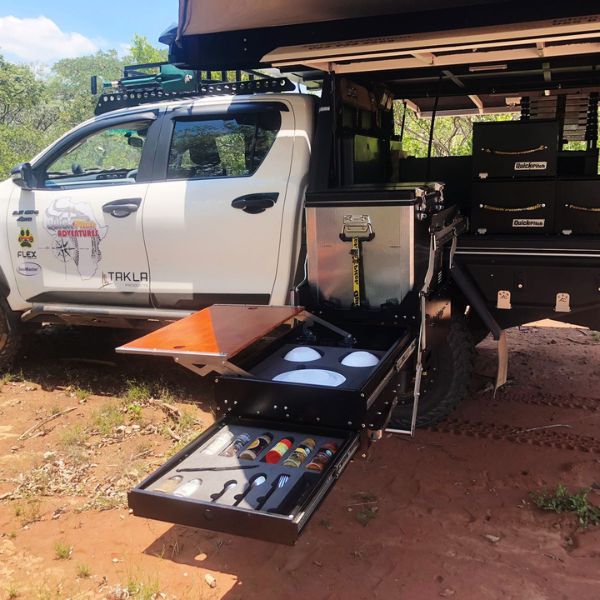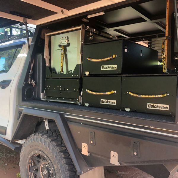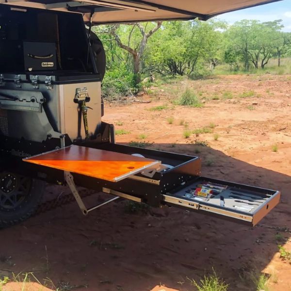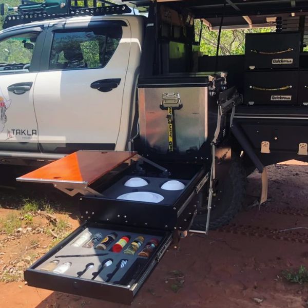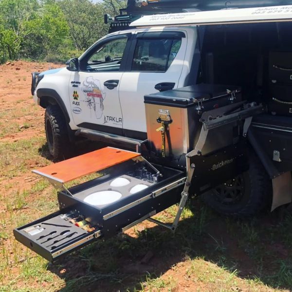 The Quick Pitch Drop-Down Kitchen Combo was designed as a perfect solution for an overlander with a flat tray vehicle.